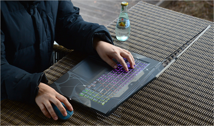 노트북의 디자인은 깔끔하고 세련된 것을 확인할 수 있다. 노트북 테두리와 내부에 반투명 재질을 사용해 색다른 멋을 선사하며 화려한 RGB 키보드까지 적용되어 게이밍 노트북 다운 화려함도 즐길 수 있었다. (비슷한 가격대의 게이밍 노트북중 이정도의 디자인 완성도를 보여주는 노트북을 찾는 것은 결코 쉽지 않을 것이다.)