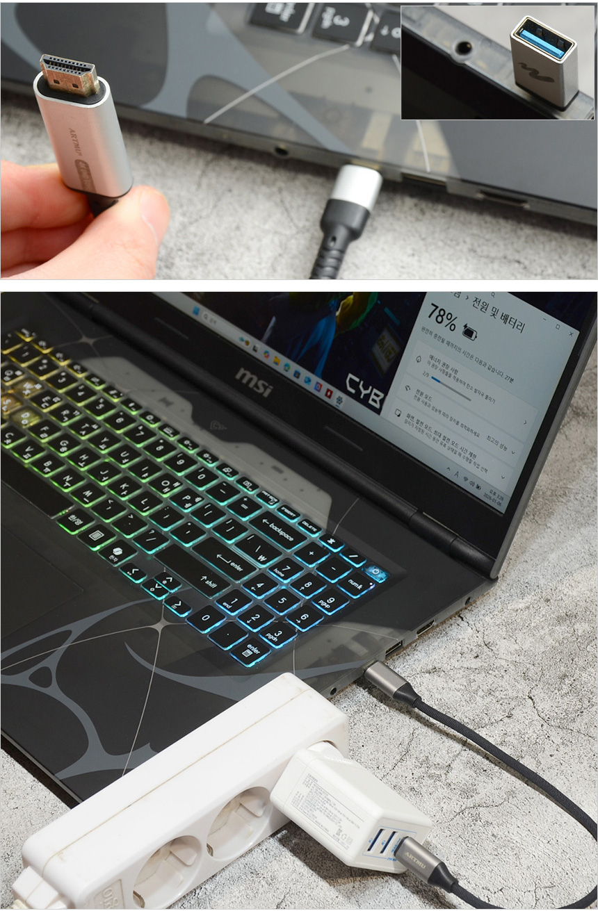 C타입 단자는 빠른 데이터 전송 뿐만 아니라 디스플레이 출력 기능을 지원해 고해상도 모니터를 연결할 수 있으며 젠더를 장착하면 일반 주변기기도 편하게 사용할 수 있다. 또한 PD 충전도 지원해 외부에서 손쉽게 전원을 공급할 수 있다. (65W PD 충전기도 인식하는 것을 확인할 수 있었다. 단, 고성능 노트북이기 때문에 100W PD충전기 사용을 권장한다.)