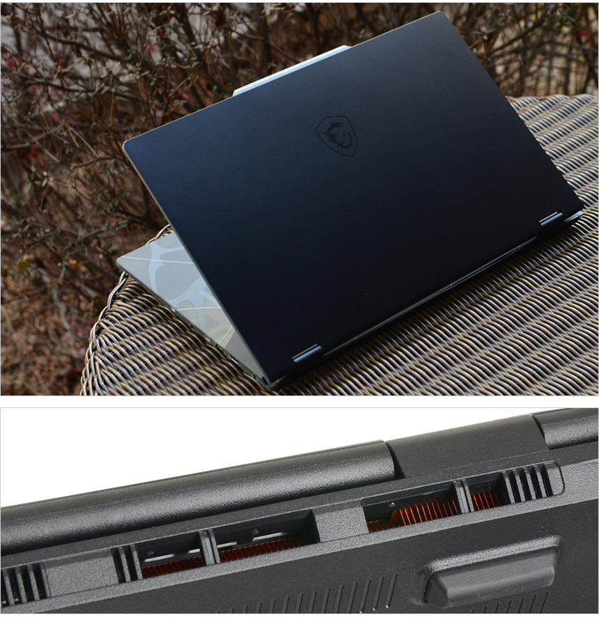 노트북 후면부의 모습으로 뜨거워진 공기가 빠져나오는 통풍구가 설치되어 있다. 이 제품은 열을 효과적으로 방출하기 위한 히트파이프 설계로 장시간 고성능 구현이 가능하다.