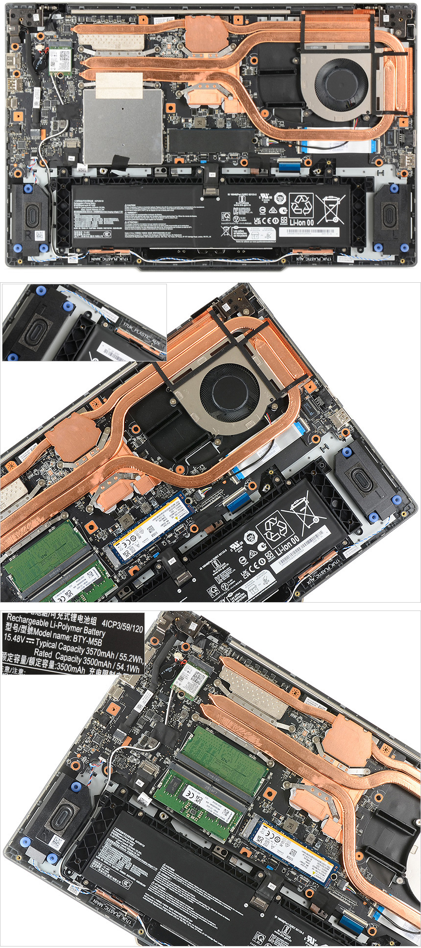 바닥면 내부의 모습으로 낮은 소비전력으로 작동하는 모델답게 싱글팬이 장착되어 있으며 히트파이프가 CPU와 GPU에 연결되어 있어 빠르게 열을 식혀준다. 하단에는 3570mAh 용량의 리튬이온 배터리가 설치되어 있고 스피커와 무선랜 안테나도 설치된 것을 확인할 수 있다.