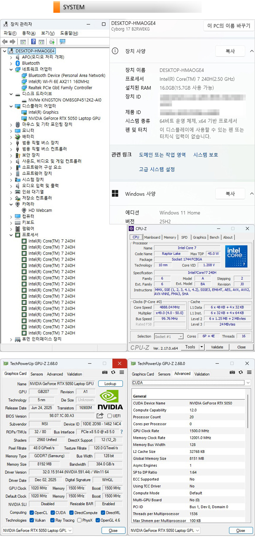 시스템 정보를 확인하고 있는 모습으로 6개의 성능코어와 4개의 효율코어로 구성된 (16 스레드 & 24MB 캐시) 인텔코어 7 프로세서 240H가 장착되어 있고 RTX 5050 랩탑 GPU와 8GB DDR5 메모리, 512GB PCIe 4.0 NVMe SSD 등으로 구성된 것을 확인할 수 있다. @ 테스트용 노트북에는 8GB 메모리가 추가되어 있다. 이점 참조 바란다.