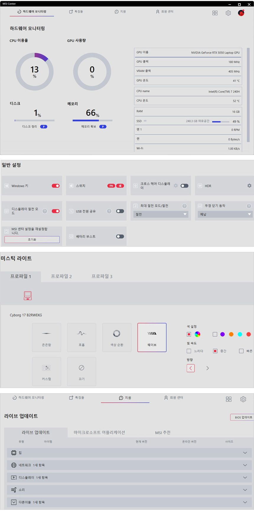 시스템 모니터링이 가능하고 일반설정 에서는 윈도우키와 USB 상시전원 등을 조정할 수 있다. 또한 미스틱 라이트 (조명) 설정도 가능하며 업데이트를 통해 최상의 컨디션으로 노트북을 사용할 수 있다.