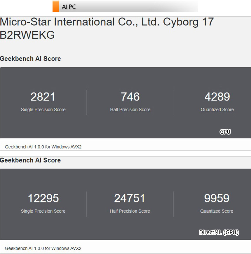 AI 전용 벤치마크 툴을 이용해 AI 성능 테스트를 진행하고 있는 모습으로 내장그래픽 기반의 보급형 노트북과 확연하게 비교되는 높은 스코어를 보여주었다. 다양한 AI 애플리케이션을 편하게 사용할 수 있을 것이다.
