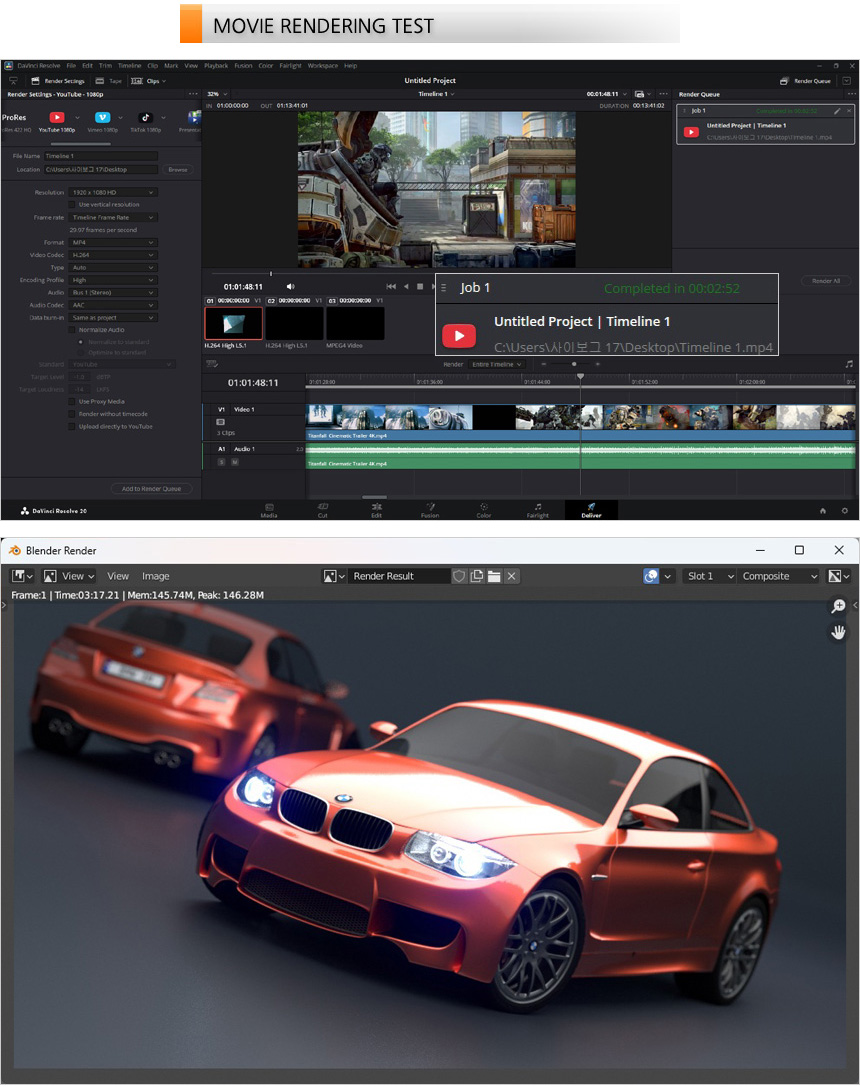 영상편집 S/W 다빈치 리졸브를 이용해 랜더링 테스트를 진행하고 있는 모습으로 (640MB, 920MB, 990MB 4K 동영상을 단일 동영상으로 랜더링, FHD 해상도에 H.264 비디오 코덱) 2분 52초가 소요되는 것을 확인할 수 있었다. 또한 블랜더 랜더링 테스트에서도 3분 17초가 소요되었다. @ 작업용으로도 충분히 사용할 수 있는 빠른 속도를 보여주었다. (참고로 CPU 사용율이 높은 블랜더 랜더링의 경우 인텔코어 5 210H 탑재모델 대비 37초 빠른 속도를 보여주었다.)