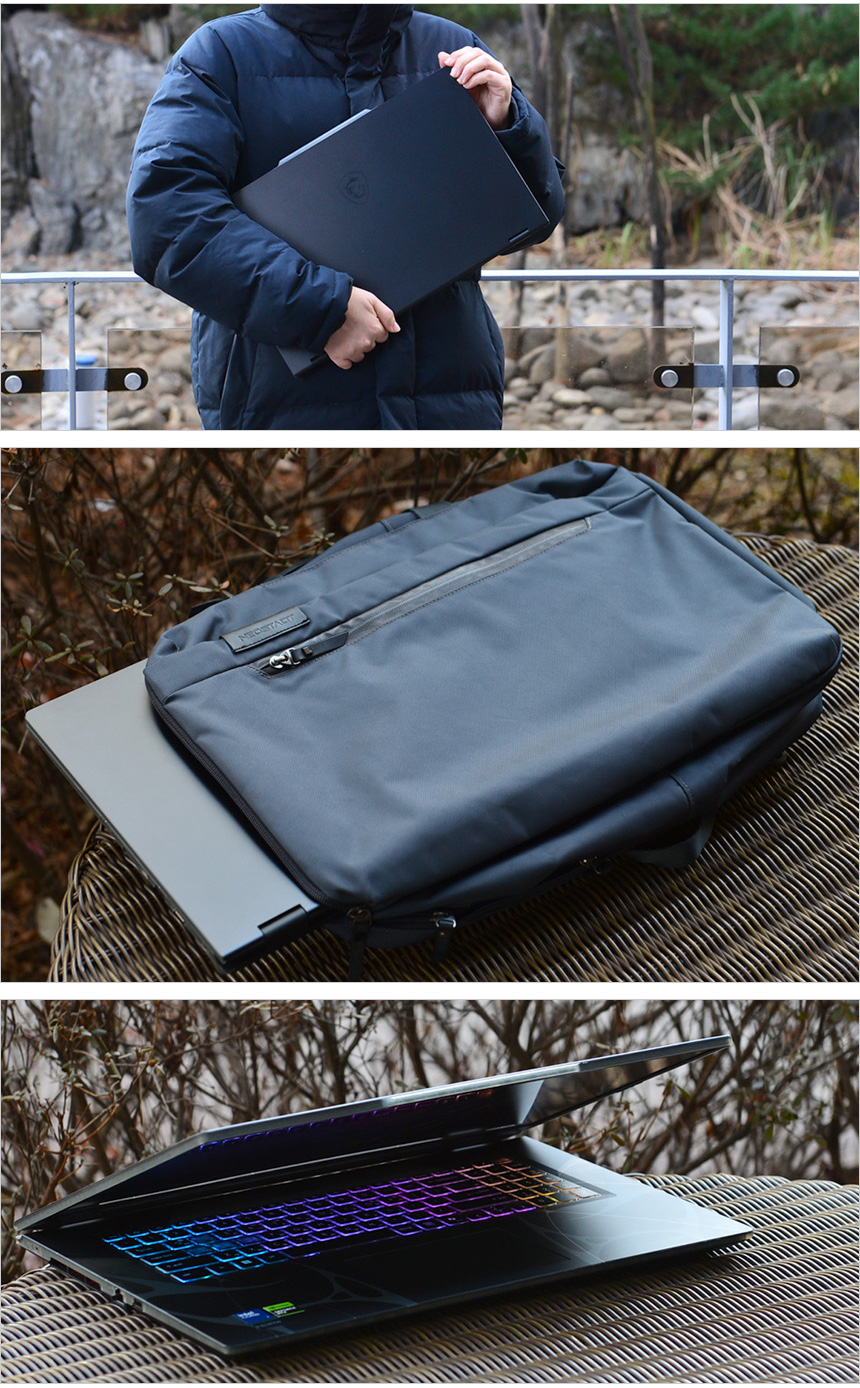 게이밍이나 작업에 특화된 고성능 노트북이지만 외장그래픽 간섭을 최소화 하면 외부에서도 충분히 사용할 수 있다. 배터리 사용시간도 긴편이며 구형 모델에서는 지원하지 않았던 PD충전을 지원해 손쉽게 전원을 공급할 수 있다. (제품 크기가 상당하기 때문에 이동시에는 백팩을 사용하기 바란다.)