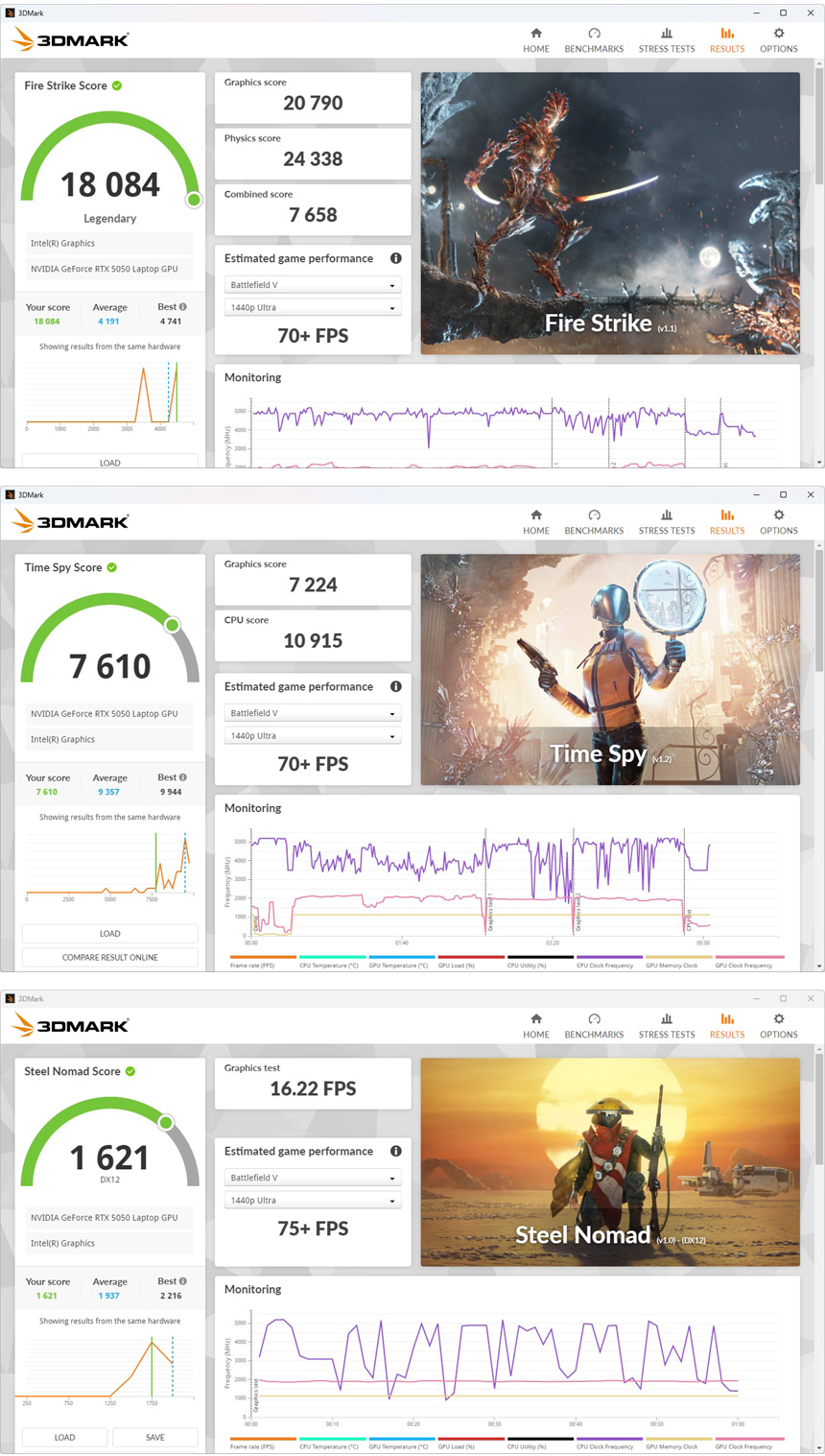 3DMARK를 이용해 3D 성능을 확인하고 있는 모습으로 대부분의 게임을 상위 옵션에서 즐길 수 있는 스코어를 보여주었다. @ RTX 4060 랩탑 GPU와 성능이 대동소이 하다.