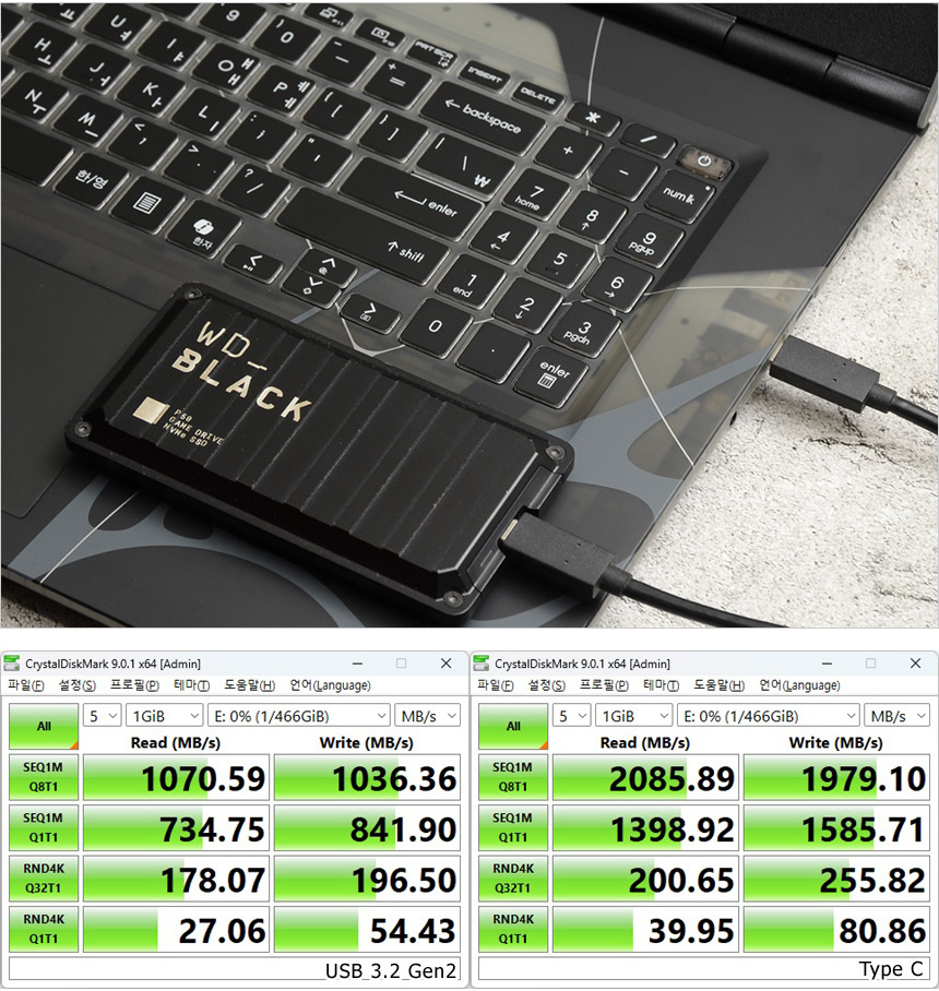 USB 속도를 확인하고 있는 모습으로 C타입 단자가 썬더볼트 4와 같은 2,000MB/s 이상의 빠른 속도를 보여주었다. (저장장치는 USB 3.2 Gen2x2 지원 모델이다.) 빠른 데이터 전송이 필요할 경우 만족스럽게 사용할 수 있을 것이다.
