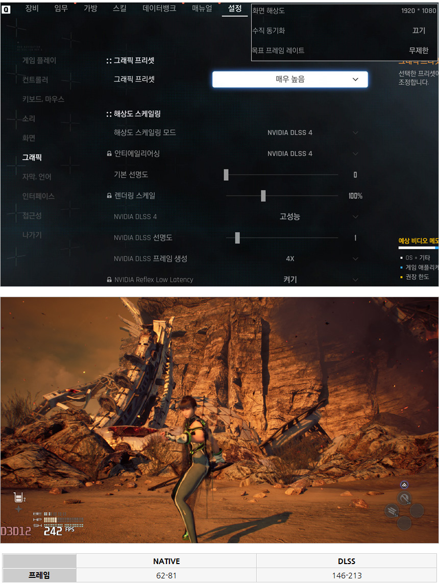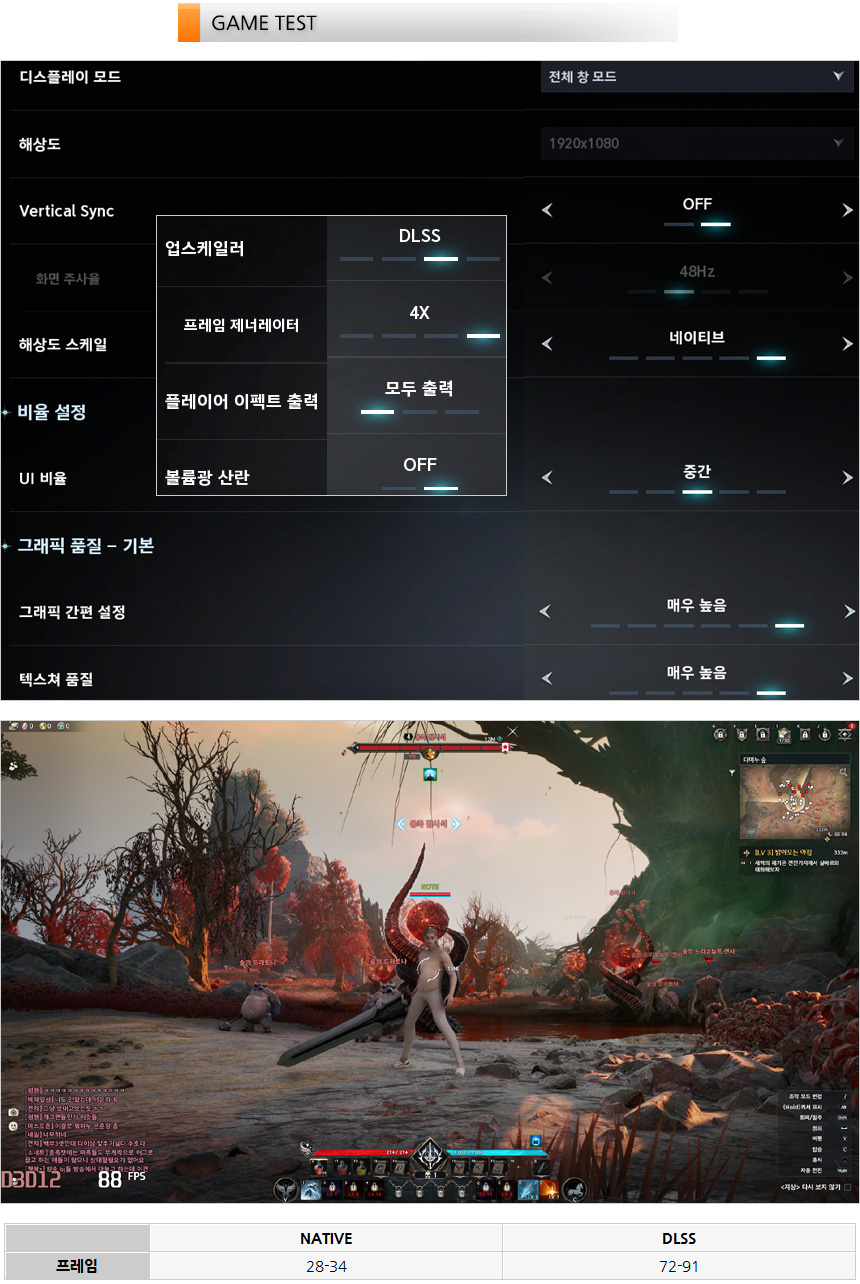 대작게임 아이온2를 플레이 하고 있는 모습으로 매우 높음 옵션으로 설정했을 때 네이티브 상태에서는 30 프레임을 살짝 넘기는 것을 확인할 수 있었다. DLSS를 활성화 하고 프레임 생성을 활용하면 80 이상으로 프레임이 높아져 훨씬 부드럽게 게임을 즐길 수 있었다. (그래픽 옵션이나 해상도 스케일을 조정하면 더 높은 프레임으로 게임 플레이가 가능하다.)
