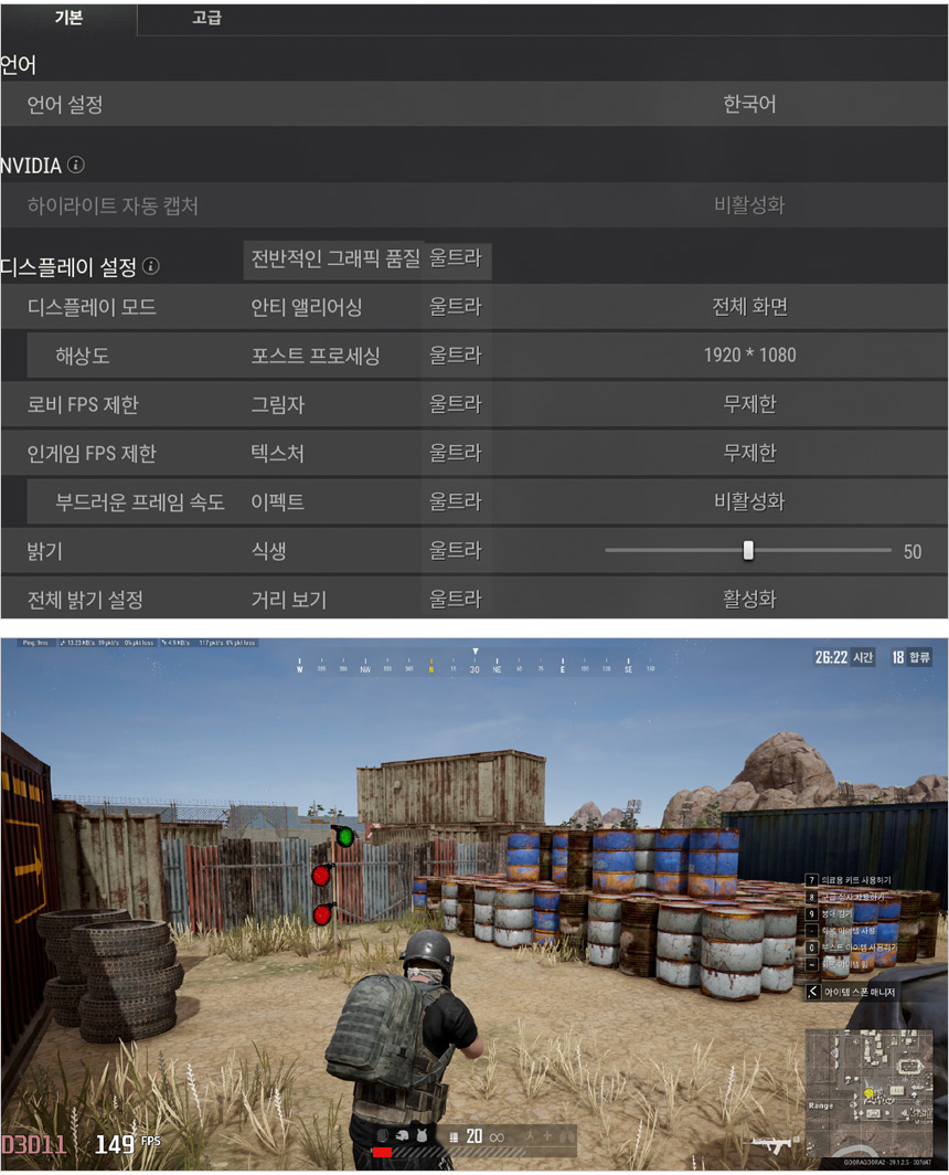 배틀그라운드를 플레이 하고 있는 모습으로 (연습장) 울트라 옵션 설정시 126-142 프레임을 보여주었다. 국민옵션 등을 적용해 프레임이 최대한 확보된 상태에서 게임을 플레이 하면 훨씬 부드럽게 즐길 수 있을 것이다.