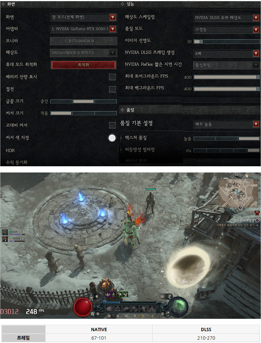 디아블로 4를 매우 높음 옵션으로 플레이 하고 있는 모습으로 DLSS를 사용하지 않아도 충분히 게임을 즐길 수 있다. 단, DLSS를 활성화 하면 프레임이 확연하게 높아지기 때문에 DLSS를 사용하고 프레임을 생성해 게임을 즐기기 바란다.
