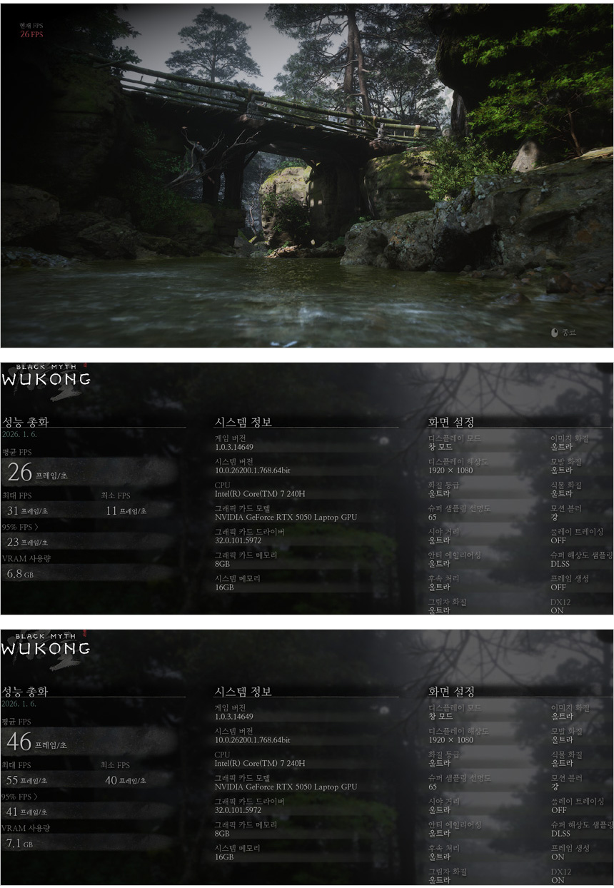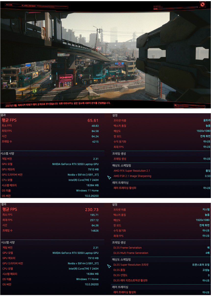 물론 RTX 5050 랩탑 GPU를 탑재한 모델이기 때문에 DLSS와 같은 업스케일링 기술을 적극 활용해야 한다. 예전만 해도 업스케일링 기술로 인한 성능향상이 미비했을 뿐만 아니라 지원 게임도 많지 않아 깡성능에 의존해 게임을 즐겨야 했지만 최신 게임들의 경우 대부분 DLSS4를 지원할 뿐만 아니라 프레임 생성도 가능해 높은 옵션에서도 부드럽게 게임을 즐길 수 있다.