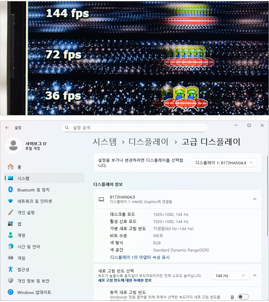 60Hz 주사율을 지원하는 일반 노트북과 달리 게이밍 노트북 답게 144Hz 주사율 지원으로 끊김 없는 부드러운 움직임으로 생생한 화면을 체감할 수 있다. 상단의 사진은 144Hz 주사율을 쉽게 인지할 수 있도록 하위 프레임과 같이 재생되는 영상 (960 Pixel Per Sec) 을 셔터스피드 1/20 로 촬영한 모습으로 프레임이 높아질수록 시간당 많은 화면이 뿌려져 캐릭터의 수가 많은 것을 확인할 수 있다. 직접 눈으로 영상을 볼 경우 72Hz나 36Hz 의 경우 화면이 늘어지고 깨지는 느낌을 주는데 반해 144Hz 의 경우 자연스럽게 UFO 가 이동한다.