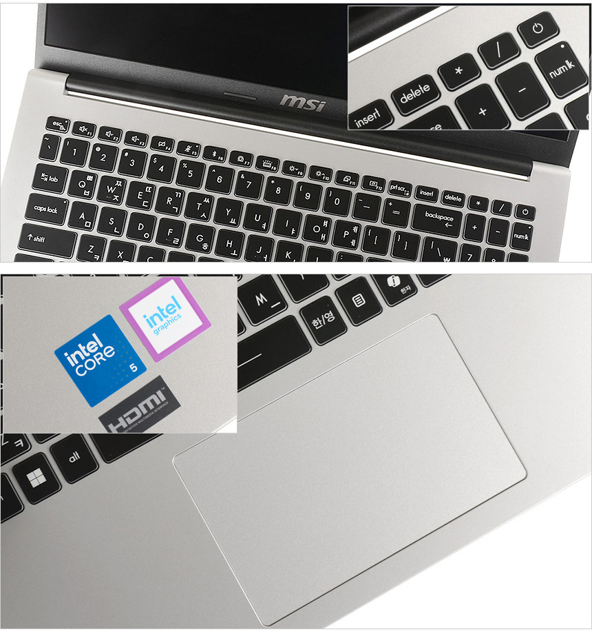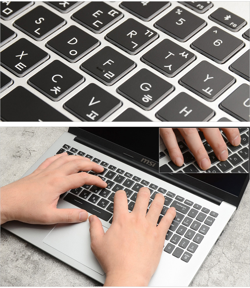 키보드의 모습으로 15.6형 대화면 노트북 답게 텐키가 부착된 풀사이즈 키보드가 제공되는 것을 확인할 수 있으며?(14형 모델에서는 텐키를 지원하지 않는다.)?백라이트를 지원하지 않는 보급형 제품들과 달리 밝기 조절이 가능한 화이트 LED 백라이트가 설치되어 어두운 야간에도 불편없이 노트북을 사용할 수 있다. 특히 키캡 테두리 부분까지 빛이 들어와 확연한 구분감을 제공한다.