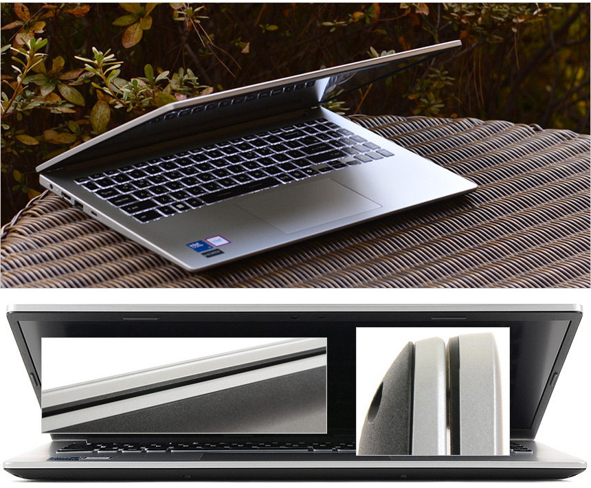 바닥면에 여유공간이 생기는 드롭힌지 적용으로 차가운?공기가 원활하게 노트북 내부로 유입되며 키보드에 각도가 형성되어 자연스러운 타이핑이 가능하다.?(스크레치 방지를 위해 고무패드가 부착된 것이 눈에 띈다.)