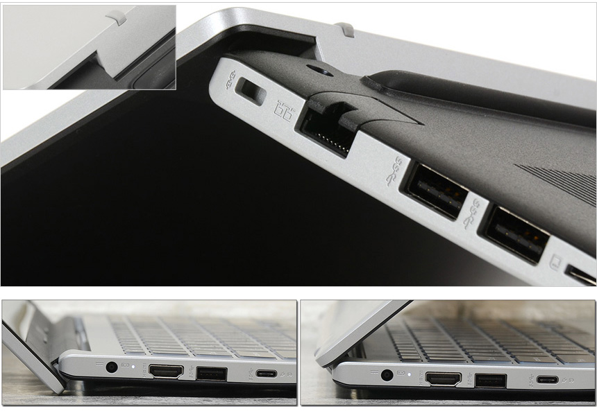 노트북 우측면의 모습으로 도난 방지를 위한 시큐리티 홀을 비롯해 유선 네트워크 사용을 위한 이더넷 단자를 지원하며?(기업 환경에서는 보안을 이유로 유선랜 사용을 권장하고 있기 때문에 비즈니스 노트북에서는 중요한 부분이다.)?2개의 USB 3.2 Gen1 단자를 지원해 편하게 주변기기를 연결할 수 있다. 또한 데이터 백업을 위해 microSD 카드리더를 제공하며 이어폰이나 헤드셋 연결을 위한 오디오?(COMBO)?단자도 지원한다. 참고로 이 제품은 프리미엄 노트북에 적용되는 Hi-Res 오디오 규격 DAC가 탑재되어 뛰어난 음질을 경험할 수 있다.