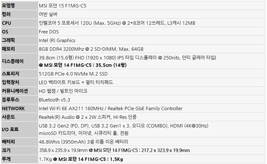 새로운 모던 시리즈는 15.6형 디스플레이를 탑재한 모던 15 F1MG-C5 와 14형 디스플레이가 장착된 모던 14 F1MG-C5 로 출시된다. 대화면으로 고화질 동영상을 즐기거나 숫자 입력등이 많을 경우 텐키가 기본 제공되는 모던 15 F1MG-C5를 추천하며 작은 크기와 가벼운 무게로 편하게 들고 다니며 다양한 장소에서 사용하고 싶다면 모던 14 F1MG-C5 가 좋은 대안이 될 것이다.