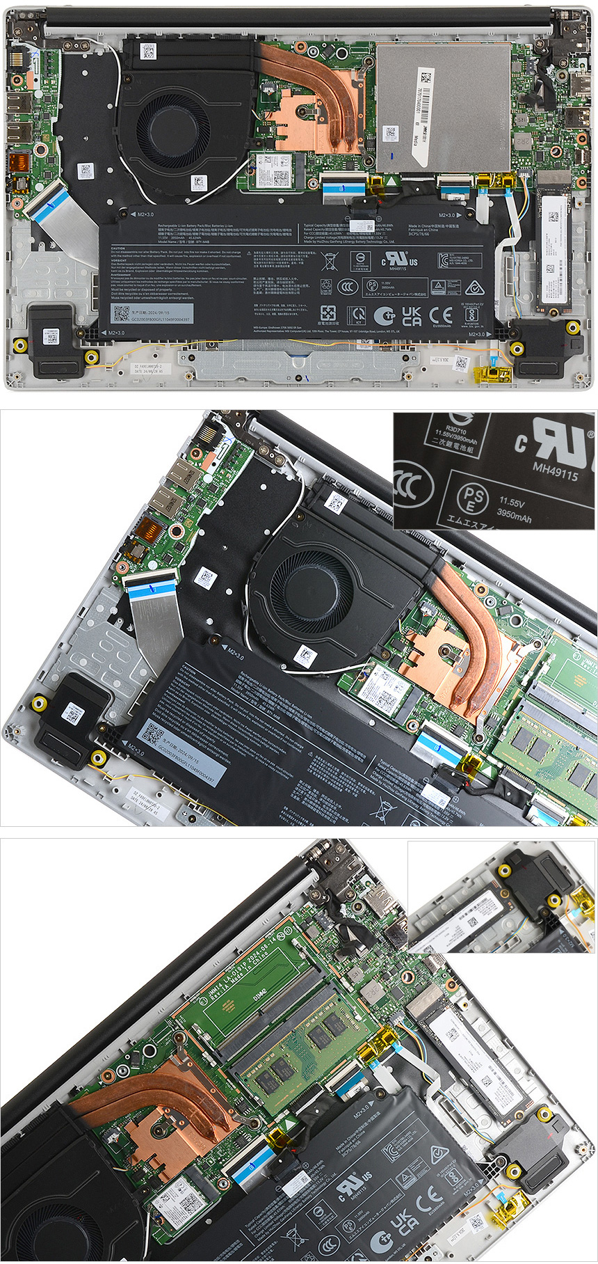 바닥면 내부의 모습으로 CPU의 열을 제어하기 위해 팬과 히트파이프가 설치된 것을 확인할 수 있으며 하단에는 3950mAh 용량의 리튬이온 배터리와 스피커가 장착된 것을 확인할 수 있다.