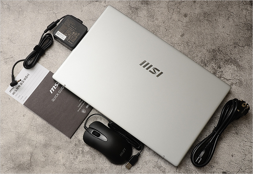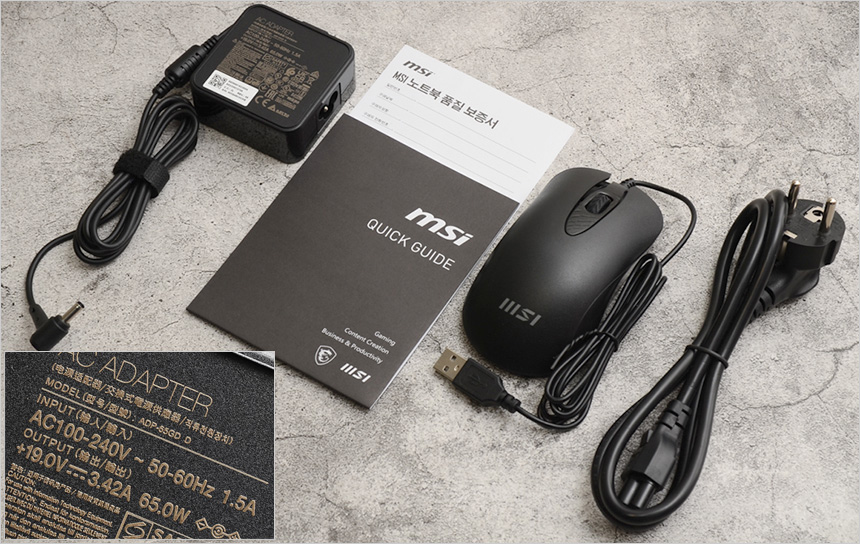 풀KIT 의 모습으로 노트북을 비롯해 65W 전원 어댑터와 전원 케이블이 제공되며 퀵 매뉴얼과 보증서가 포함된 것을 확인할 수 있다. 또한 마우스를 기본 제공해 편하게 노트북을 사용할 수 있다.