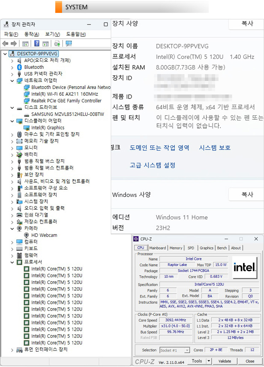 시스템 정보를 확인하고 있는 모습으로 2+8코어 12스레드에 12MB 캐시가 장착된 인텔코어 5 120U 프로세서가 탑재되어 있고 8GB DDR4 메모리, 512GB NVMe SSD가 장착되어 캐주얼한 작업은 부드럽게 실행할 수 있다. 또한 디자인 부분에서 언급한 것과 같이 고급형 무선랜카드 인텔 AX 211이 제공되며 HD 웹캠이 설치된 것도 확인할 수 있다.