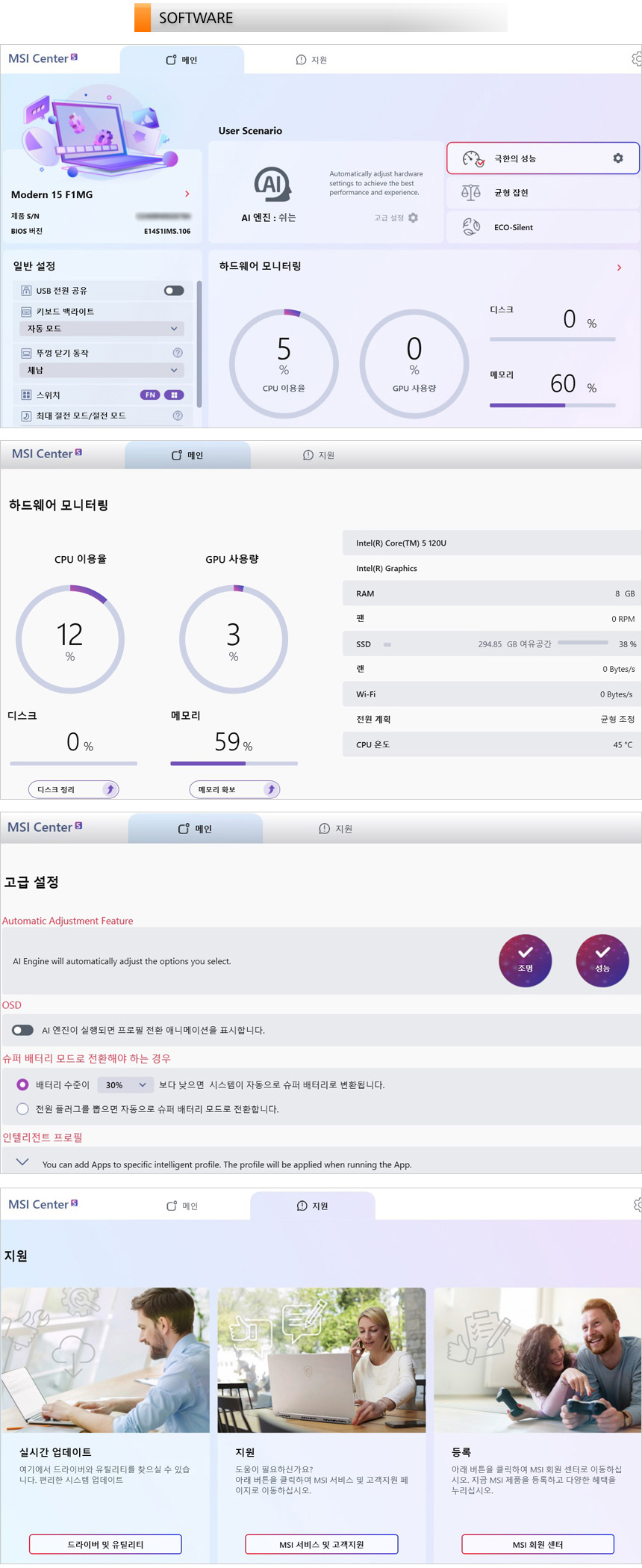 기존 MSI 노트북과 달리 메인 화면에서 대부분의 기능을 실행할 수 있는 MSI Center S 가 제공되는 것을 확인할 수 있다. 시스템 모니터링을 비롯해 퍼포먼스 설정과 AI 엔진 설정을 지원하며 업데이트를 지원해 최상의 컨디션으로 노트북을 사용할 수 있다.