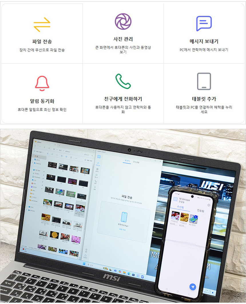 인텔 유니슨을 사용하면 노트북에서 전화를 걸거나 문자 등을 전송할 수 있다. 또한 파일전송 기능을 제공해 사진과 같이 상호간 파일전송이 가능하다.?(업무용으로 스마트폰을 사용하고 있다면 유용하게 기능을 활용할 수 있을 것이다.)