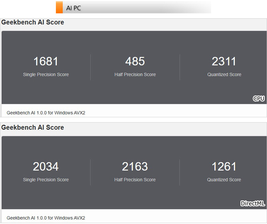 AI 전용 벤치마크 툴을 이용해 AI 성능 테스트를 진행하고 있는 모습으로 고성능 노트북이나 AI 에 특화된 노트북에 비할바는 아니지만 코파일럿 이나 기타 AI 프로그램을 충분히 활용할 수준의 스코어를 보여주었다.
