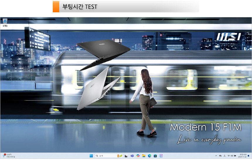 노트북이 완전히 꺼진 상태에서 전원 버튼을 눌러 바탕화면이 노출될 때 까지의 시간?(콜드부팅)?을 측정했는데 9초가 소요되었다. 기다림의 지루함 없이 노트북을 사용할 수 있을 것이다.?(최근 테스트한 노트북중 가장 빠른 부팅시간을 보여주었다.)
