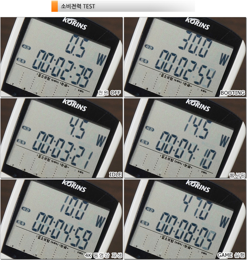 소비전력 테스트를 진행하고 있는 모습으로?(최고성능 모드)?저전력 프로세서가 탑재된 모델답게 게임을 제외한 대부분의 상황에서 20W 미만의 낮은 소비전력으로 작동하는 것을 확인할 수 있었다.?(게임 실행시에는 최고 47W 까지 소비전력이 올라갔으며 대부분 40W 초반에서 동작했다.)