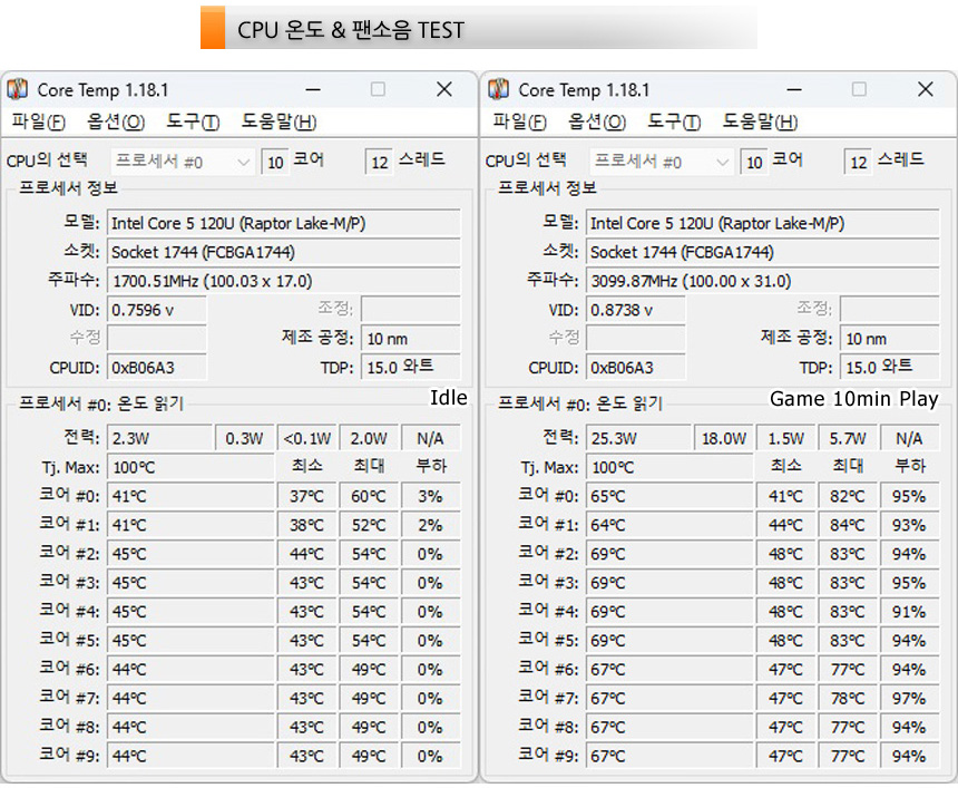 CPU 온도를 측정한 모습으로?(최고성능 모드, 실내온도 17도)?아무것도 하지 않은 IDLE 상태에서는 40도 초반으로 작동했으며 10분 동안 오버워치2를 실행한 후 온도를 측정했을 때에는 70도 초반까지 온도가 올라가는 것을 확인할 수 있었다.?@ 가끔 80도 이상으로 올라가기는 했지만 대부분 70도를 넘지 않았다.
