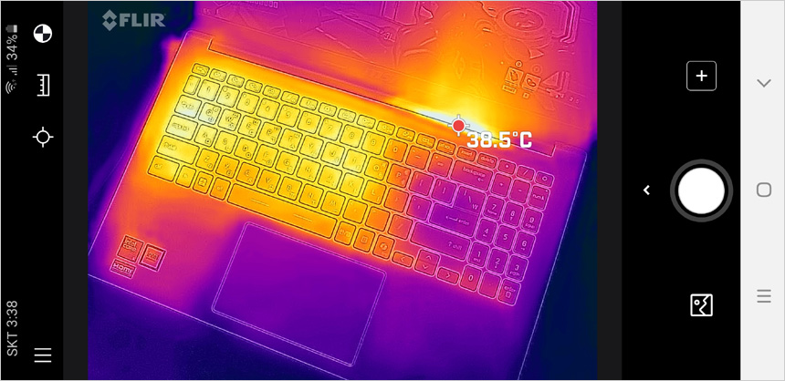 열화상 카메라를 이용해 게임 실행중 노트북의 열분포를 확인하고 있는 모습으로 좌측면을 중심으로 열이 퍼져 나가며 팬이 설치된 우측은 상대적으로 온도가 낮은 것을 확인할 수 있다. 또한 힌지 부분에 있는 통풍구에서 원활하게 열이 빠져나가는 것도 확인할 수 있다.?(팜래스트 온도는 상당히 낮아 열로 인한 스트레스 없이 노트북을 사용할 수 있다.)