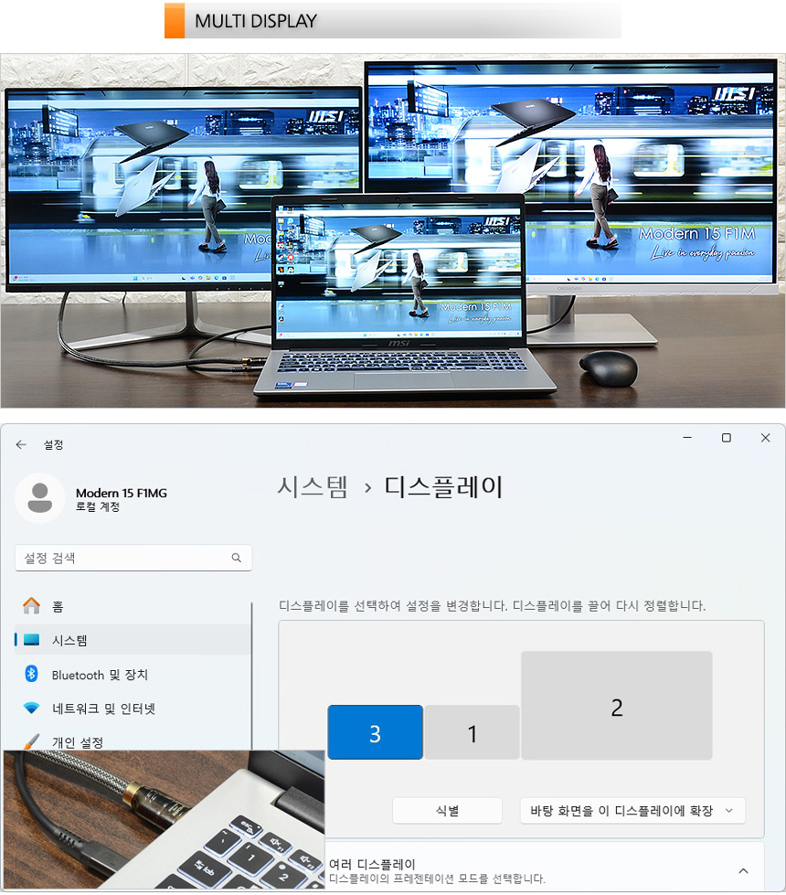 C타입 단자가 디스플레이 출력 기능을 지원해 2개의 모니터를 연결할 수 있다. 상단의 사진은 4K 모니터와 FHD 모니터를 연결한 모습을 정상적으로 인식되는 것을 확인할 수 있었다.?(4K@30Hz 지원)?멀티테스킹이 필수적인 유저들은 모니터를 추가 연결해 편하게 작업할 수 있다.