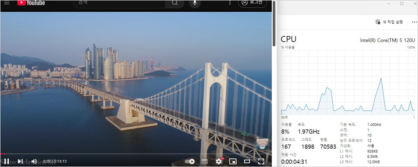 유튜브 고화질 동영상을 이용해 CPU 점유율을 테스트 하고 있는 모습으로 (2160P@60FPS) 7-21% 대의 점유율을 보여 주었으며 인터넷을 실행했을 때 80% 후반까지 점유율이 올라갔지만 영상의 끊어짐등은 발생하지 않았다.