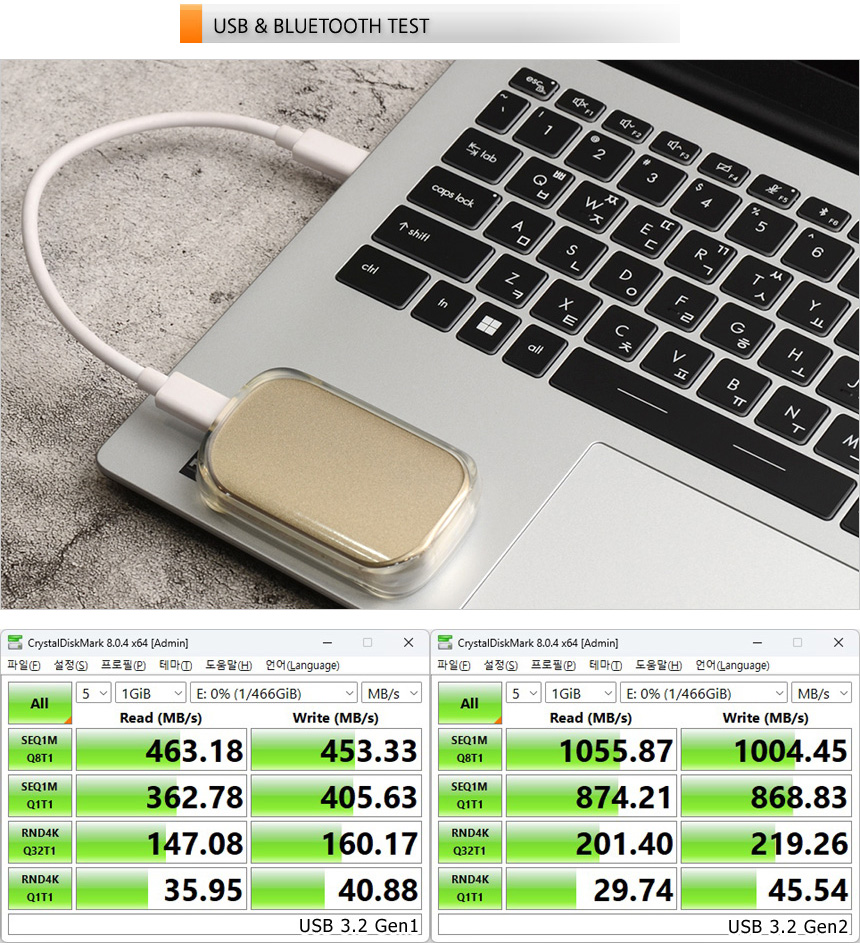 C타입 단자가 USB 3.2 Gen2를 지원해 빠른 데이터 전송이 가능하다. 상단의 사진은 외장 SSD를 이용해 USB 3.2 Gen1과 비교한 모습으로 속도차가 큰 것을 확인할 수 있었다.