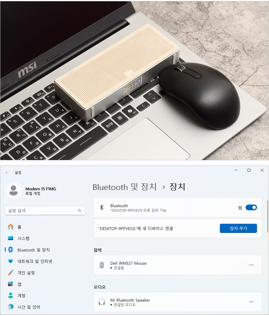 블루투스를 지원해 다양한 액세서리를 무선으로 연결할 수 있다. 상단의 사진은 스피커와 마우스의 연결 모습으로 원활하게 페어링 되는 것을 확인할 수 있었으며 완벽하게 작동했다.