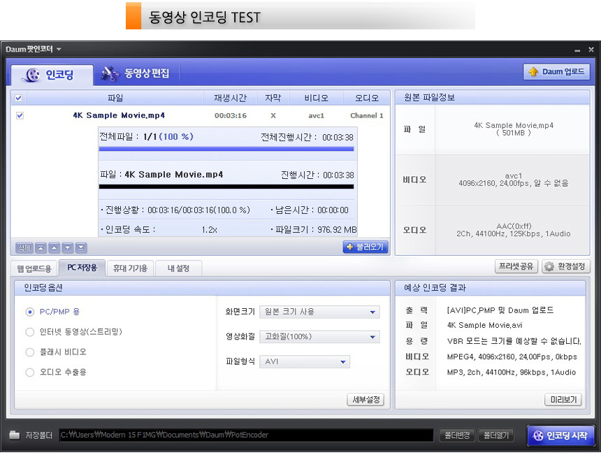 4K 동영상을 이용해 인코딩 테스트를 진행하고 있는 모습으로 3분 38초가 소요되는 것을 확인할 수 있었다.?(저전력 프로세서 탑재 모델이지만 인코딩 시간은 상당히 빠른 편이다.)