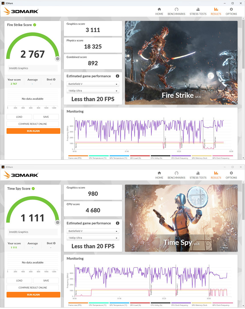 3DMARK를 이용해 3D 성능을 확인하고 있는 모습으로 가벼운 3D 게임은 부드럽게 플레이 할 수 있는 스코어를 보여 주었다.