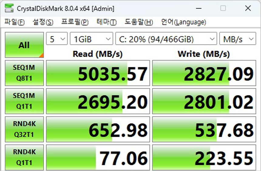 저장장치 속도 테스트를 진행하고 있는 모습으로 PCIe 4.0 NVMe SSD를 장착해 HDD 나 SATA SSD를 탑재한 모델들과 확연히 비교되는 빠른 속도를 보여주는 것을 확인할 수 있다. 특히 512GB 대용량을 지원해 여유롭게 파일등을 저장할 수 있다.