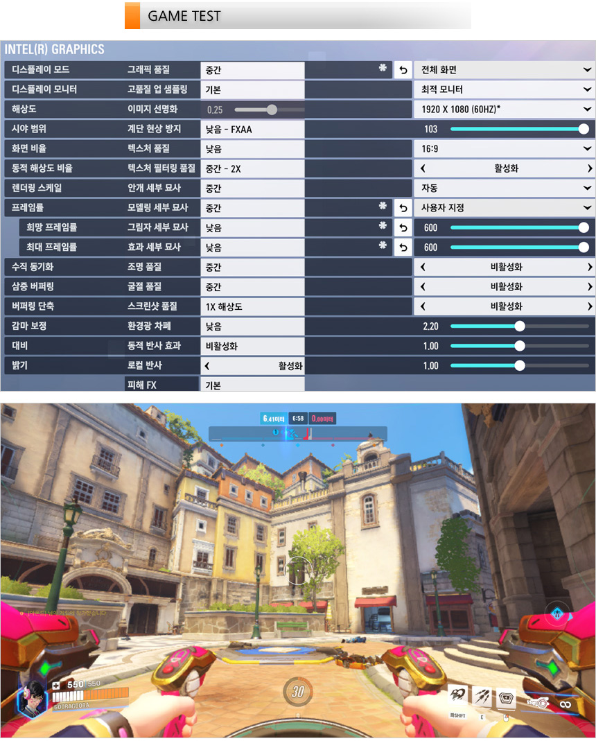 오버워치2 를 이용해 프레임 테스트를 진행하고 있는 모습으로 중간옵션에서 37-61 프레임을 보여주었다. 약간 벅차기는 하지만 오버워치2 정도는 충분히 즐길 수 있는 노트북이다.?(게임을 즐기고 싶다면 메모리를 추가해 듀얼채널로 구성하기 바란다.)