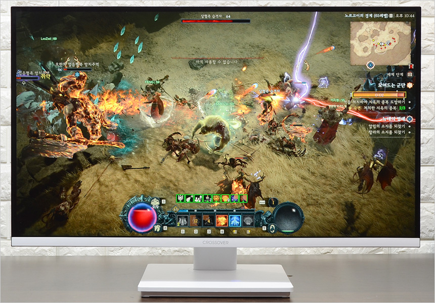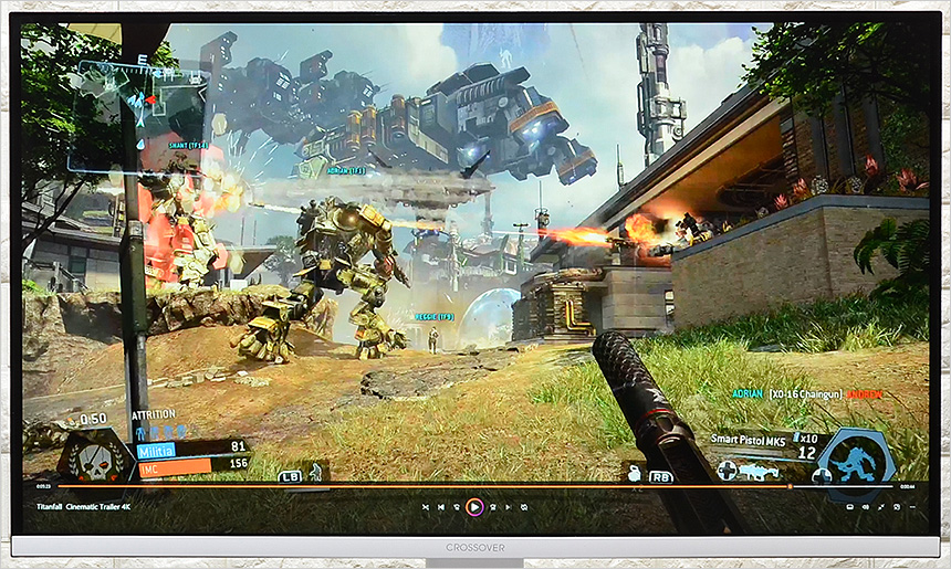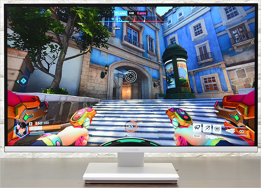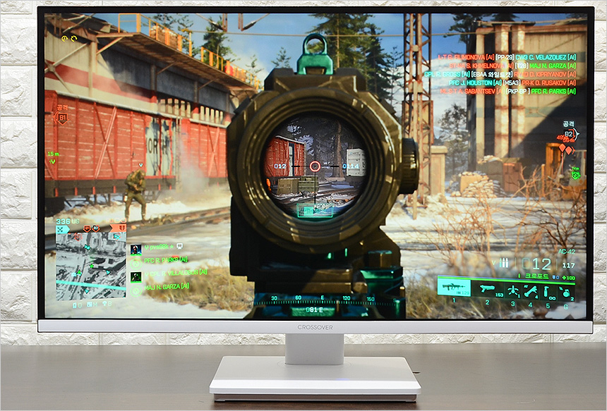 오버워치2 와 배틀필드 2042를 이용해 게임 테스트를 진행하고 있는 모습으로 100Hz 주사율을 지원하는 모델답게 부드러운 영상을 선사했다.?(빠른 주사율 덕분인지 장시간 테스트를 진행 했음에도 어지러운 느낌이 들지 않았다.)?또한 사진과 같이 조준선도 지원해 사격 정확성을 높일 수 있었으며 IPS 패널 탑재 모니터 답게 진하고 선명한 컬러 표현이 인상적이었다. 144Hz 이상의 게이밍 모니터와 차이가 있긴 하지만 FPS 게임용으로도 충분히 활용할 수 있을 것이다.