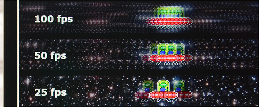 상단의 사진은 100Hz 의 높은 주사율을 쉽게 확인할 수 있도록 하위 프레임과 같이 재생되는 영상?(960 Pixel Per Sec)을 셔터스피드 1/20 로 촬영한 모습으로 프레임이 낮을수록 캐릭터의 수가 적으며 프레임이 높아질수록 시간당 많은 화면이 뿌려지기 때문에 캐릭터의 수가 많은 것을 확인할 수 있다.