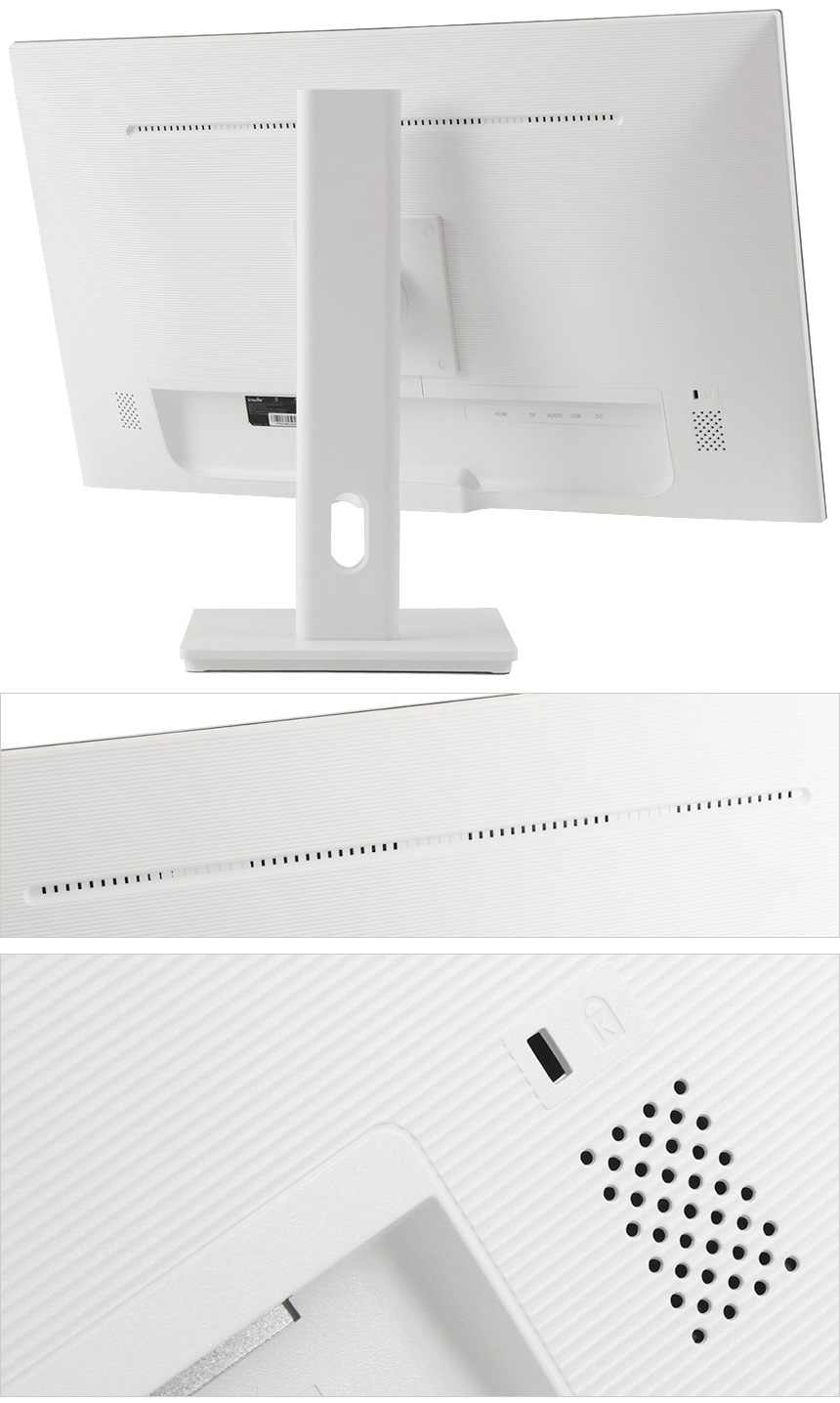 모니터 후면부의 모습으로 상단에 통풍구가 설치되어 있고 도난 방지를 위한 시큐리티 홀이 제공되는 것도 확인할 수 있다. 또한 양 측면에는 3W 스피커가 장착되어 시원시원한 사운드를 즐길 수 있다.