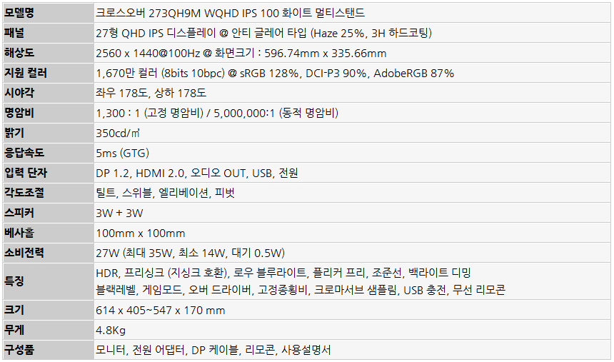 화질 성능 모두챙긴 가성비 모니터, 크로스오버 273QH9M WQHD IPS 100 화이트 멀티스탠드