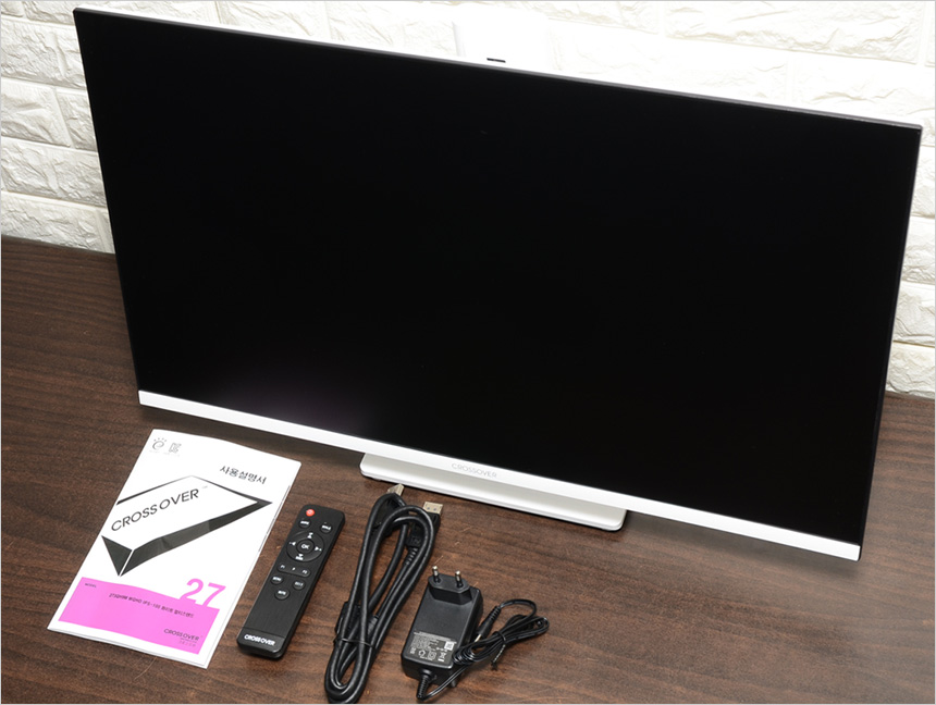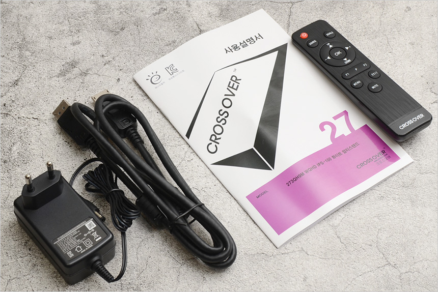 액세서리의 모습으로 케이블 일체형 전원 어댑터를 비롯해 DP 케이블과 사용설명서, 무선리모콘을 제공한다.
