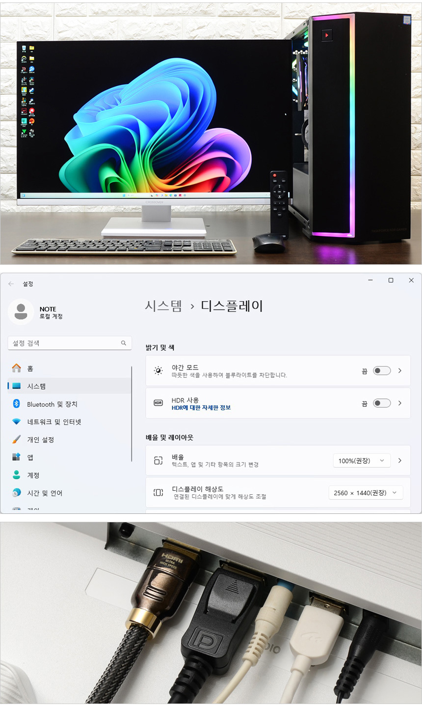 테스트를 위해 모니터와 PC를 책상에 설치한 모습으로 디자인 부분에서 언급한 것과 같이 많은 공간은 차지하지 않았다. 27형의 크기에 슬림 베젤을 적용한 모니터로 집이나 사무실 등에서 편하게 사용할 수 있을 것이다. 이 제품은 DP 단자를 지원해 PC와 편하게 연결할 수 있으며 HDMI 단자도 제공해 게임콘솔이나 IPTV 와 같은 멀티미디어 디바이스와 연결해 사용할 수 있다.