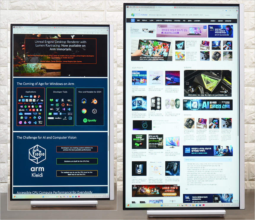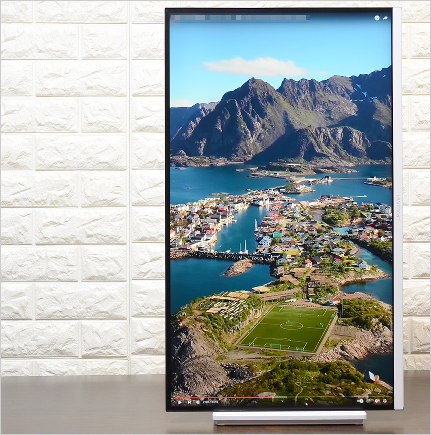 멀티스탠드를 적용해 사용성을 높인점도 인상적이었다. 사용자에 맞게 화면 각도를 조정해 사용할 수 있을 뿐만 아니라 피벗모드를 활용하면 문서나 주식차트 등을 편하게 확인할 수 있으며 세로영상을 감상하기 용이했다. 모니터 암을 구입하지 않고 세로모드를 사용할 수 있는점은 큰 매리트라 할 수 있다.