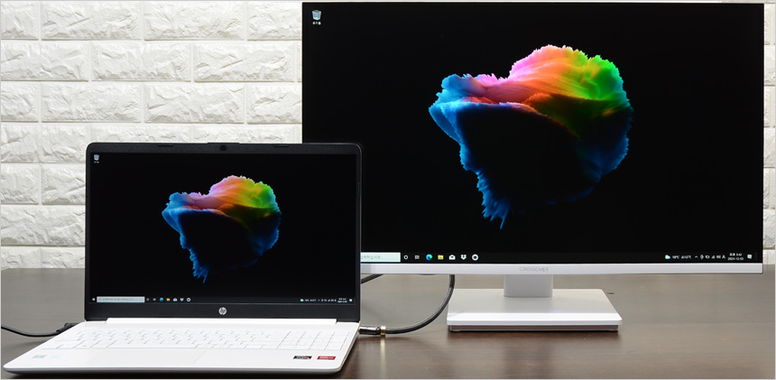 노트북과 HDMI로 연결한 모습으로 원활하게 작동하는 것을 확인할 수 있었다. 집이나 노트북사무실에서 대화면으로 노트북을 사용하고 싶을 경우 좋은 대안이 될 것이다.