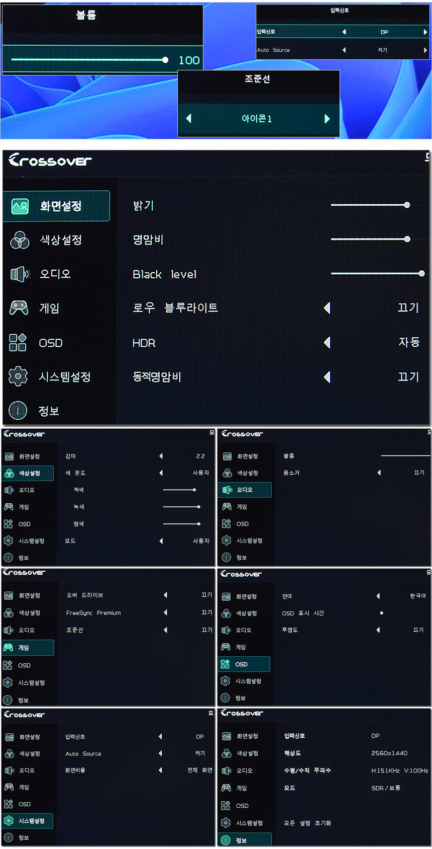 모니터 설정을 위한 OSD를 지원한다. 리모콘에서 핫키를 지원해 볼륨, 입력소스, 조준선 등을 빠르게 선택할 수 있으며 메인메뉴를 통해 밝기와 명암 설정을 비롯해 모드 및 동적 명암비 설정이 가능하다. 또한 고정종횡비 설정이 가능하며 색온도 및 OSD 설정, 초기화, 로우블루라이드 설정과 블랙레벨, 프리싱크 설정을 지원한다.
