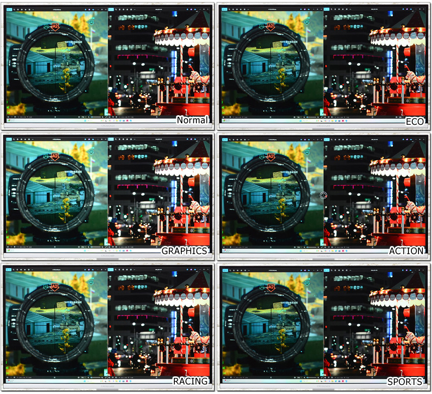 다양한 화면 모드를 제공해 게임이나 동영상 감상시 유용하게 활용할 수 있다. 상단의 사진은 지원 모드를 촬영한 모습으로 사진상에는 큰 차이가 없어 보이지만 실제 눈으로 보면 모드별로 분명한 차이를 보여주었다.