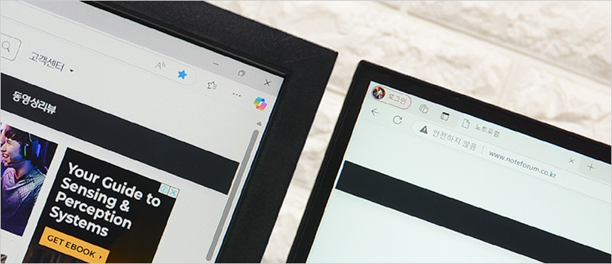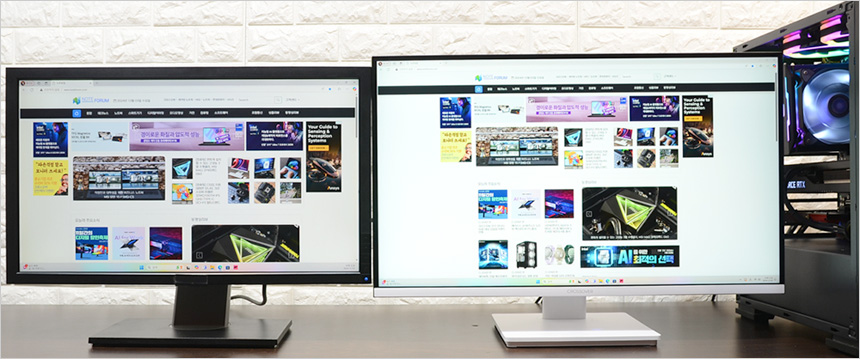 두 대의 모니터를 셋팅한 김에 베젤 두께를 비교해 보았는데 사진과 같이 큰 차이가 발생하는 것을 확인할 수 있다. 이 제품은 3면 슬림 베젤을 적용해 높은 몰입감을 경험할 수 있다.