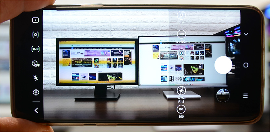 스마트폰을 이용하면 모니터의 플리커 현상을 확인할 수 있다.?(카메라 모드를 프로로 설정하고 셔터스피드 1/300 이상으로 셋팅)?테스트용 모니터는 플리커 현상이 발생하는데 반해 273QH9M WQHD IPS 100 화이트 멀티스탠드는 깜빡임 없이 부드러운 영상을 재생해 주었다.?(동영상에서 자세히 확인할 수 있다.)